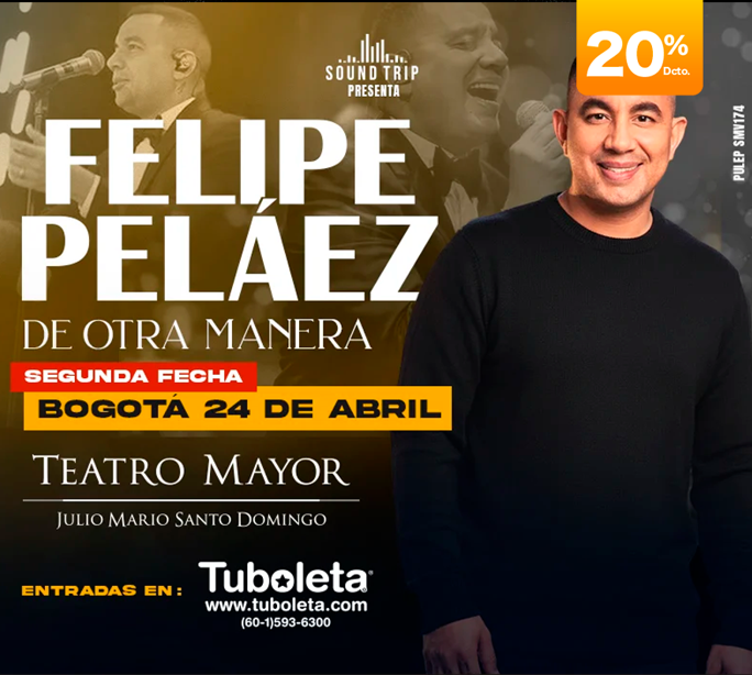 Felipe Peláez, cantante y compositor colombiano-venezolano, conocido por sus éxitos como 'Borracha', 'Lo tienes todo', 'Loco' y 'Vivo pensando en ti', llega con su tour 'De otra manera'. Será una noche mágica, única e irrepetible en Bogotá, en la que este artista compartirá con su público un show cercano e inolvidable.